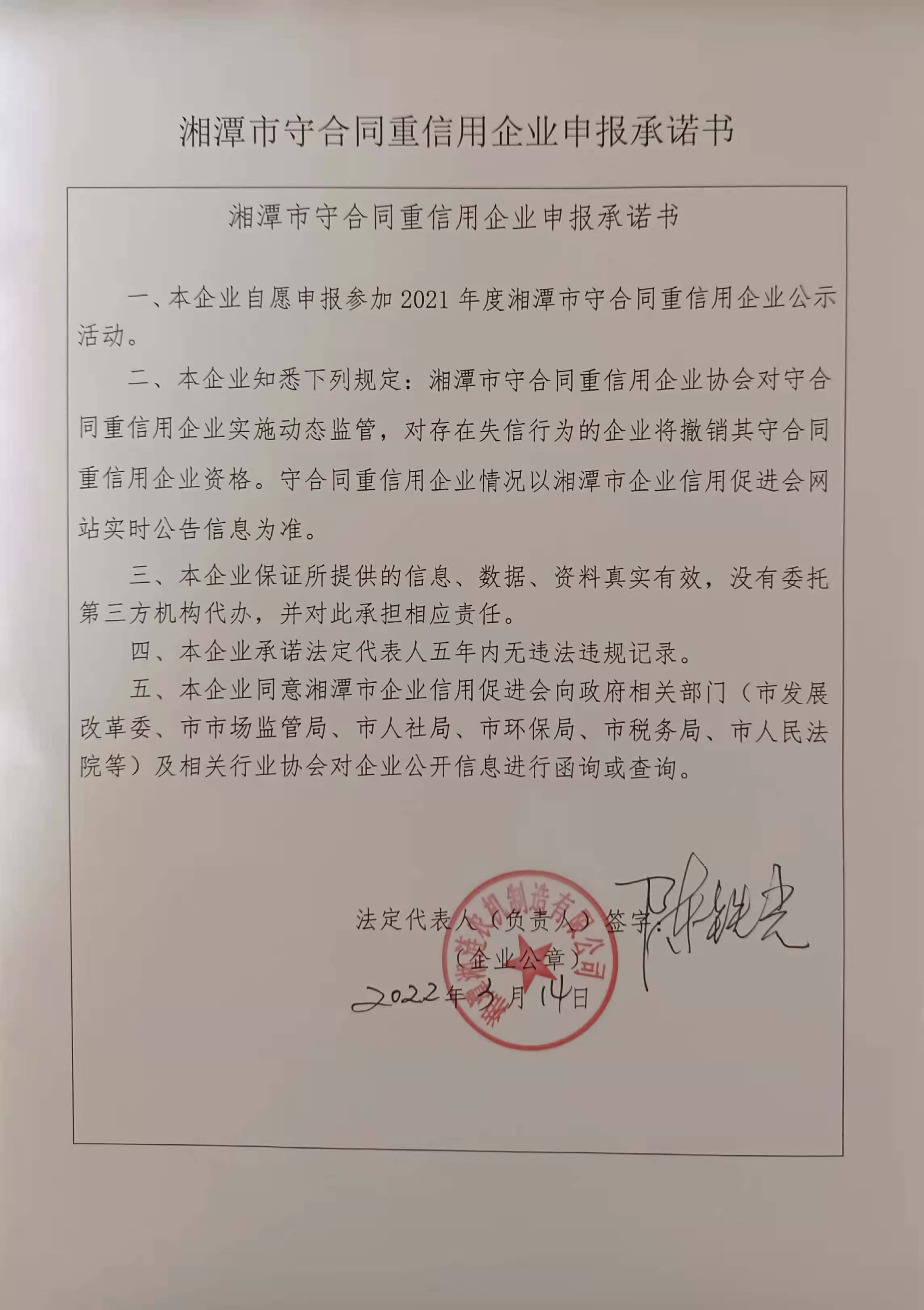 本企業(yè)根據(jù)《湘潭市守合同重信用企業(yè)申報(bào)規(guī)定》等編制 2021 年度企業(yè)信用報(bào)告書(shū),并保證本報(bào)告書(shū)內(nèi)容真實(shí)、準(zhǔn)確、完整。